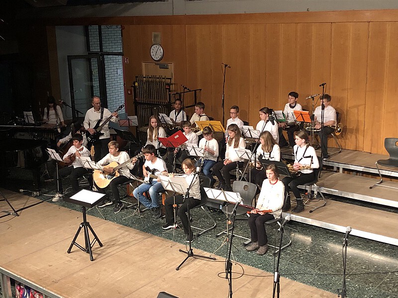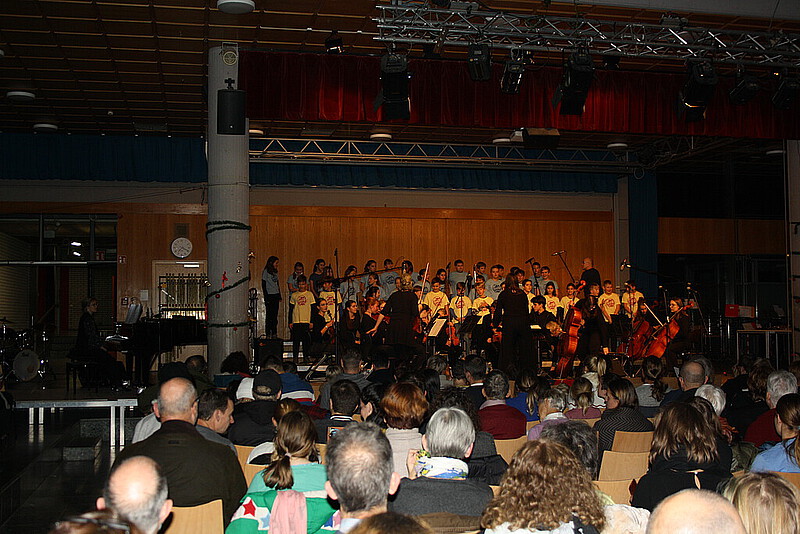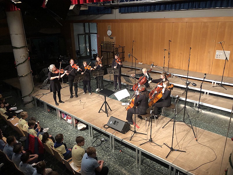 Die Musikklasse 6c, der Unterstufenchor, das Streichensemble der Jugendmusikschule, der FaustChor und die FaustBand sorgte wie angekündigt für Stimmung und „leuchtende Augen“ (Schulleiter Jürgen Gutgsell) bei Jung und Erfahren.