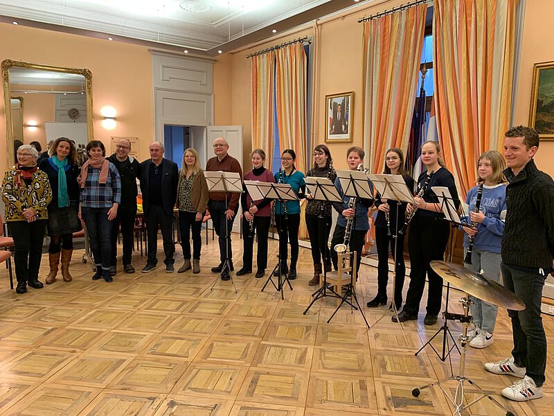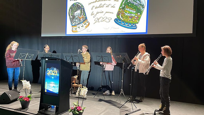 Den musikalischen Auftakt für das Jubiläumsjahr bildete die Einladung einer Gruppe junger Musiker*innen aus Staufen zur Neujahrsfeier nach Bonneville am Freitag, den 13. Januar im Centre sportif Briffod. Die Gruppe „ClarinetsforStaufen“, bestehend aus Antonia Kienzler, Dorothea Süße, Frederik Rausenberger, Lilli Künstle, Mathilda Maas und Stella Schuhmann (Klarinettenklasse von Nicole Krüger, Jugendmusikschule Staufen) wurde eingeladen, vor einem Publikum von ca. 800 Einwohnern von Bonneville und geladenen Ehrengästen zu spielen und ihr Können und Talent unter Beweis zu stellen. Tosender Applaus belohnte das virtuose Konzert der Jugendmusikgruppe. Begleitet wurde die Gruppe von einer Delegation des Partnerschaftsausschusses Bonneville.