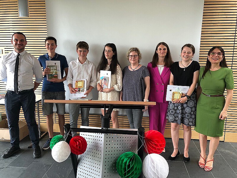 Am 12. Juli 2023 zeichnete das italienische Konsulat die besten Schülerinnen und Schüler der Freiburger Gymnasien im Fach Italienisch für ihre außerordentlichen Leistungen und ihr Engagement aus. In Anwesenheit geladener Gäste verlieh die Konsulin Francesca Toninato persönlich unseren Schülern Emilia Coco (8b), Benjamin Schubert (9a) und Carlos Paulin (10c) eine Urkunde und einen Buchpreis. Die Fachschaft Italienisch gratuliert herzlich.