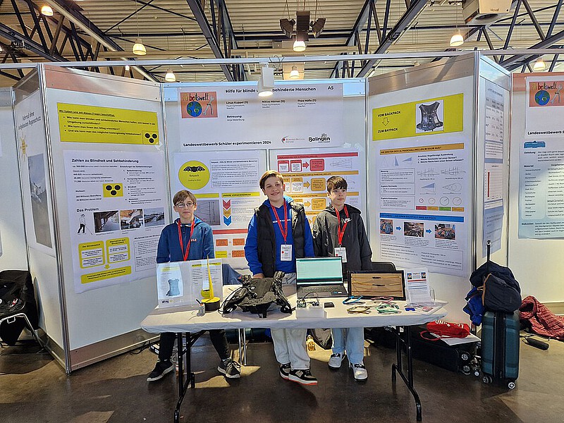 Linus, Niklas und Theo haben mit ihrem Projekt „Blindenhilfe“ im Februar und März beim Wettbewerb „Jugend forscht“ in der Sparte „Schüler experimentieren“ teilgenommen. Sie sind in Freiburg Regionalsieger geworden und durften deshalb nach Balingen (bei Stuttgart) zum Landeswettbewerb fahren. Dort waren sie wieder sehr erfolgreich und haben den 2. Platz belegt.