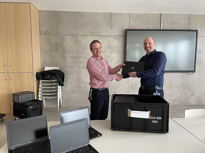 Zum Beginn des Sommerhalbjahres konnte die Fachschaft Informatik von der Firma Hekatron eine Anzahl ausgemusterte Laptops übernehmen, die im Informatikunterricht zum Einsatz kommen sollen. Herr Lautebach freute sich, von Matthias Oser (Leiter IT-Infrastruktur und IT-Support bei Hekatron) die sehr gut ausgestatteten Geräte in Empfang zu nehmen. Ausgestattet mit dem freien Betriebssystem Linux und der nötigen Software, sollen sie in der Hand der Schüler unter anderem die Unterrichtserprobung der Programmiersprache Scala ermöglichen.