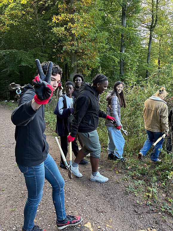 Am letzten Tag vor der Abreise trafen wir uns am Bahnhof und fuhren gemeinsam zu einer Aktion im Wald mit zwei Förstern. Nach einer kurzen Wanderung zum ausgewählten Waldgebiet war unsere Aufgabe, das Gestrüpp, das um bereits gepflanzte Eichen gewachsen ist, zu entfernen, um deren Überleben zu sichern. Mit Sägen, Gartenscheren und Handschuhen bewaffnet, arbeiteten wir über eine Stunde. Unsere Gastschüler*innen beeindruckte, wie leise es in unserem Wald ist im Vergleich zum Regenwald und wie wenig Baumarten es hier gibt. Nach diesem Ausflug verbrachten die Schüler*innen den restlichen Schultag im Nachmittagsunterricht.