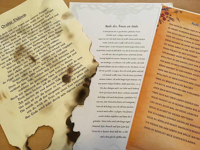 Im Unterricht haben wir neulich aber etwas gemacht, das von dem „Standard“-Latein abweicht. Wir lesen gerade Auszüge aus der "Aeneis" des römischen Dichters Vergil. Unsere Aufgabe bestand nun darin, eine Konversation zwischen zwei Charakteren, Dido und Aeneas, selbst zu gestalten. Hierbei zogen wir unsere Kenntnisse aus zuvor übersetzten Textpassagen (immer noch Latein: ein bisschen Übersetzen muss es geben) und versetzten uns in die Rollen hinein. Dann gestalteten wir freie Reden. Viele verfassten diese im daktylischen Hexameter oder wendeten eine besondere dichterische Ausdrucksweise an. Andere versahen ihre Texte mit Stilmitteln, Reimen oder lateinischen Schlüsselbegriffen, wie etwa "amor", dem "fatum" oder der "pietas". Letzteres habe ich als die schwerigste Aufgabe empfunden.