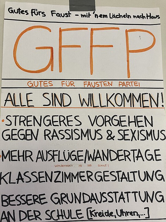 Am 28.03.2025 wurde die Klasse 8c des Faust-Gymnasiums Staufen an die Urne gebeten. Sie wählte im Rahmen des Faches Gemeinschaftskunde den Gemeinderat für Fausten. Die Gemeinde Fausten umfasst das gesamte Schulgelände. Für die Wahl traten die GFFP (Gutes Für Fausten Partei), die MFP (Moderne Fausten Partei), die NFP (Neue Fausten Partei) und die PFF (Partei Für Fausten) an.